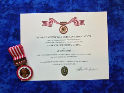 Criteria: The medal is awarded by the National Coordinator in the name of the Revolutionary War Veterans Association to a person who distinguishes himself or herself conspicuously through exceptional performance of duty and contributions at the highest levels to the RWVA Mission.